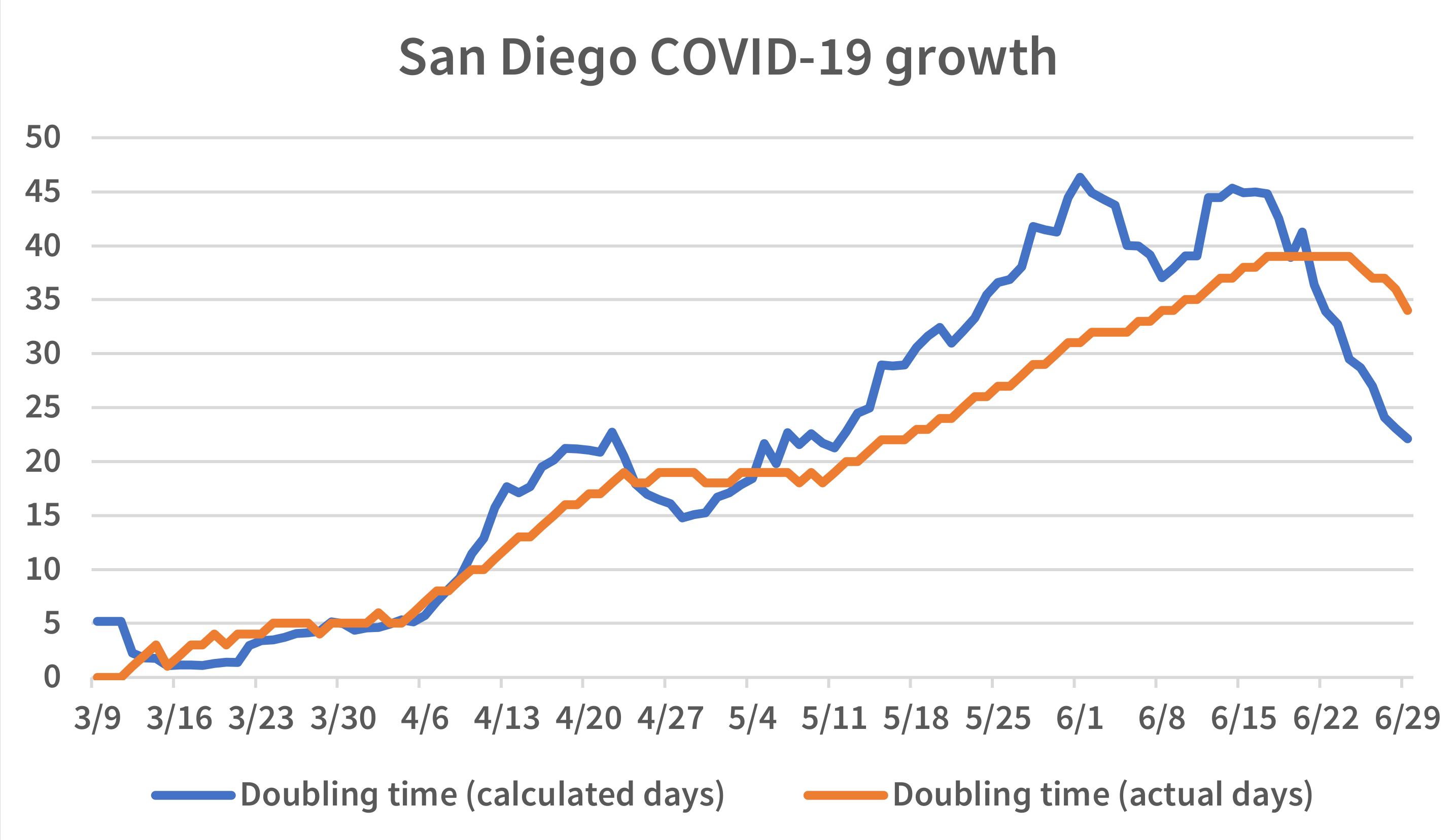COVID-19’s doubling time in San Diego. Lower numbers mean faster growth.