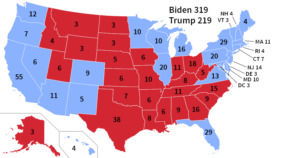 Now that Trump looks to be better, I will revise my prediction. I predict that Biden will get 319 electoral votes (EVs), and Trump only will get 219 EVs. I predict that Biden will get the sun belt (Arizona and Florida) and the rust belt (Pennsylvania, Michigan, Wisconsin, and Minnesota).
